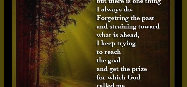 “No, dear brothers, I am still not all I should be, but I am bringing all my energies to bear on this one thing: Forgetting the past and looking forward to what lies ahead, I strain to reach the end of the race and receive the prize for which God is calling us up to heaven because of what Christ Jesus did for us.”